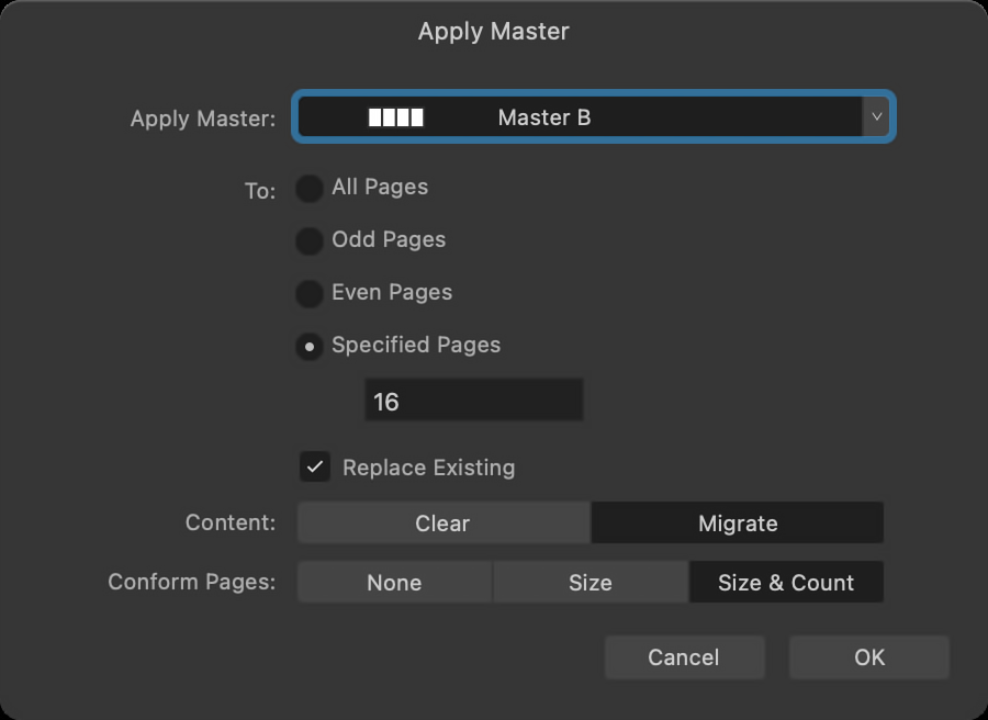 ゴーストページは、複数ページの見開きからページを削除したときにも発生します。このような場合は、必要なページ数の適切なマスターを適用し、見開きのページ数とサイズをそれに合わせるようにAffinityに指示します。
